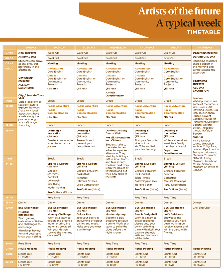 El programa incluye 20h de clase por semana divididas en 3 tipos de clases: Inglés General (Core English), Aprendizaje e Innovación (Learning & Innovation) y Enfoque: ARTES (Focus Arts).