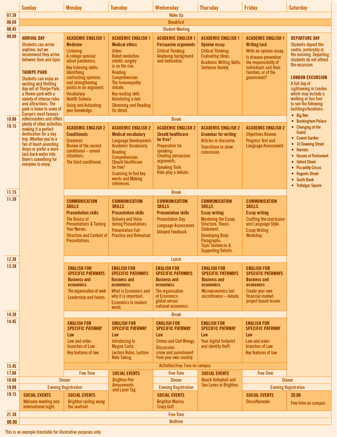 10 hours per week The morning Academic English sessions develop the students’ English language proficiency across the four skills, with a particular focus on the forms of English which are used and encountered in university settings. These include essay writing, note-taking, lectures, seminars and presentations.