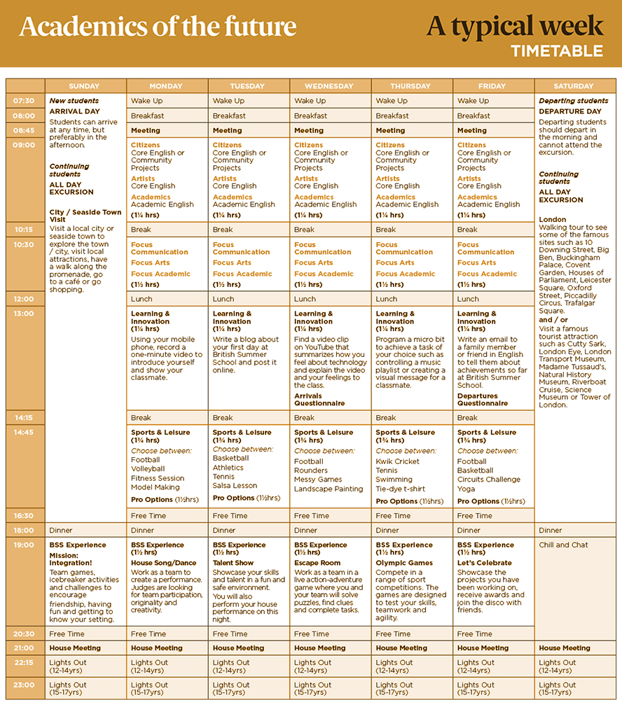 El programa incluye 20 horas de clase por semana divididas en 3 tipos de clases: Inglés General (Core English), Aprendizaje e Innovación (Learning & Innovation) y Enfoque: Académico (Focus Academic).
