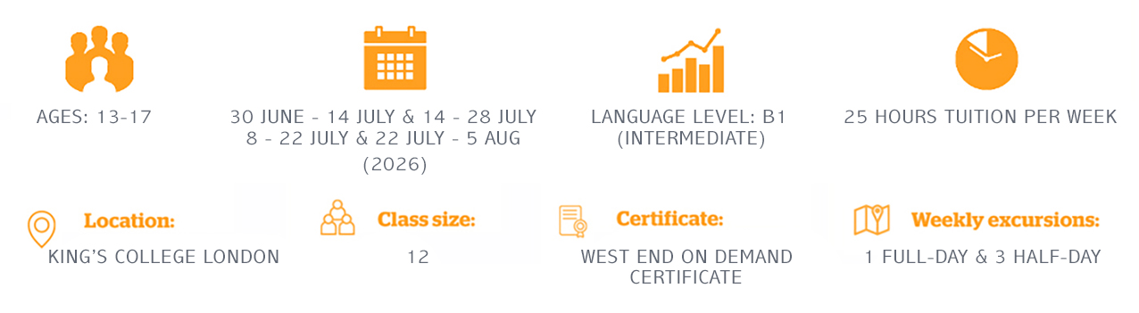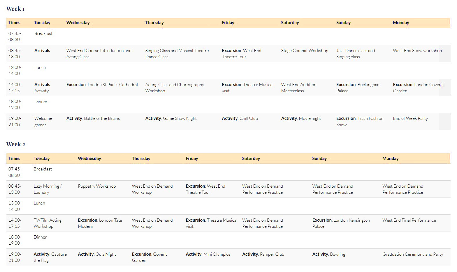 Students gain a first-hand experience of the performing arts industry through tuition in acting, singing, dancing, stage–combat and puppetry, as well as taking part in West End workshops and watching West End shows